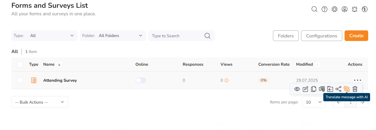 - Next to the form or survey you wish to translate, click on “Actions.”